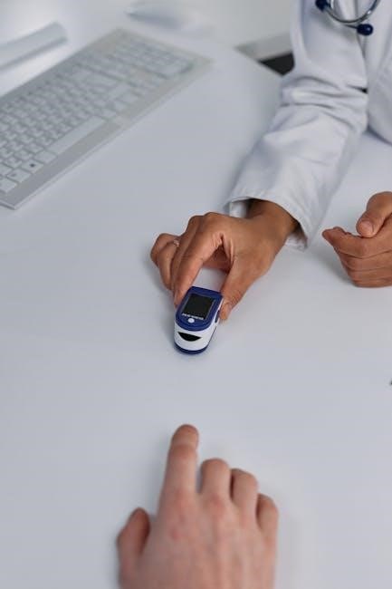 Pulse oximetry is crucial for managing respiratory conditions like COPD or asthma; It monitors oxygen levels, helping detect drops in SpO2. A pulse oximeter readings chart PDF tracks these changes, aiding in early intervention. For example, SpO2 below 95% may indicate respiratory distress. Regular monitoring with a pulse oximeter chart helps adjust treatments, such as oxygen therapy or medication. This tool is vital for improving lung health and preventing complications in patients with chronic respiratory diseases.